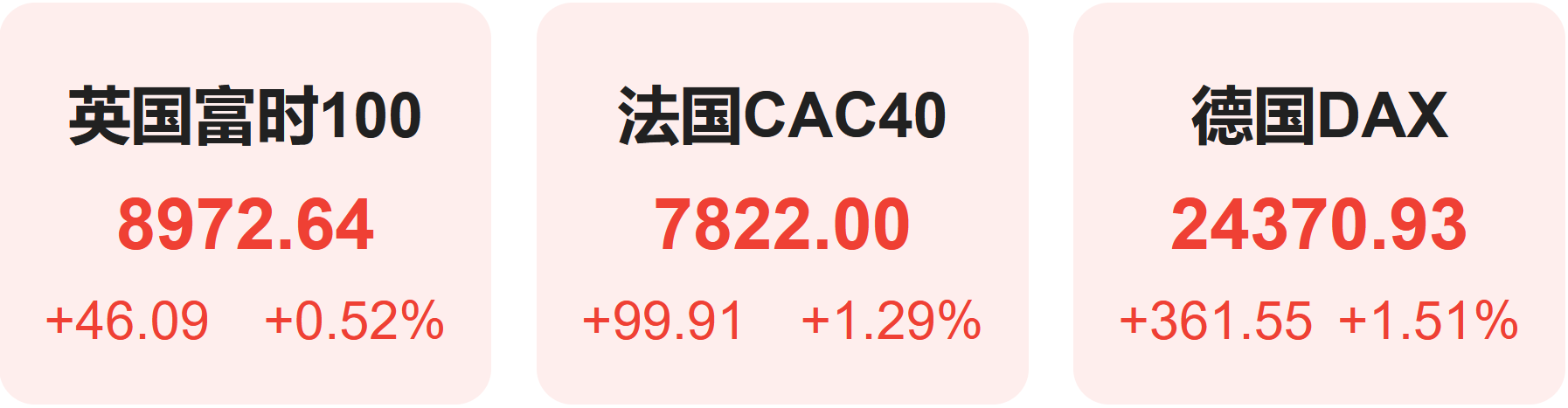 欧洲股市方面,英国富时100指数小幅上涨0.52%,报8973点。法国CAC40指数上涨1.29%,报7822点。德国DAX指数上涨1.51%,报24371点。