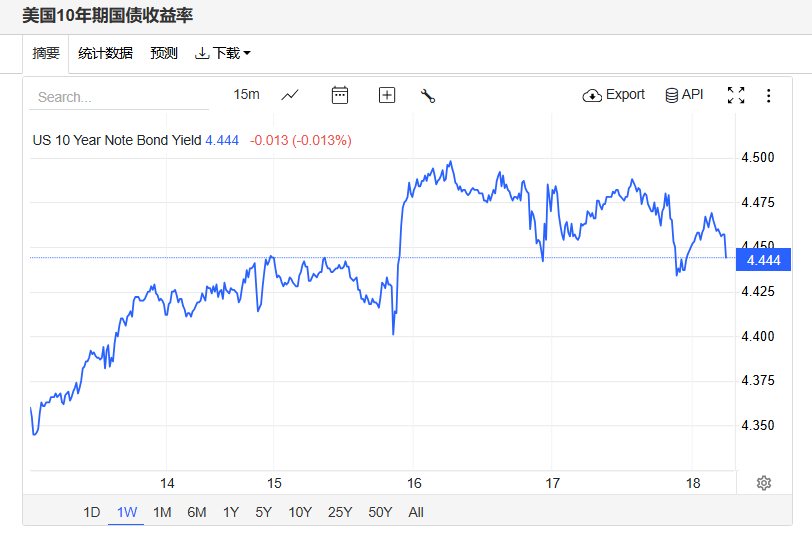 美债收益率涨跌不一,基准的10年期美债收益率收报4.444%,对利率更加敏感的2年期美债收益率收报3.913%。