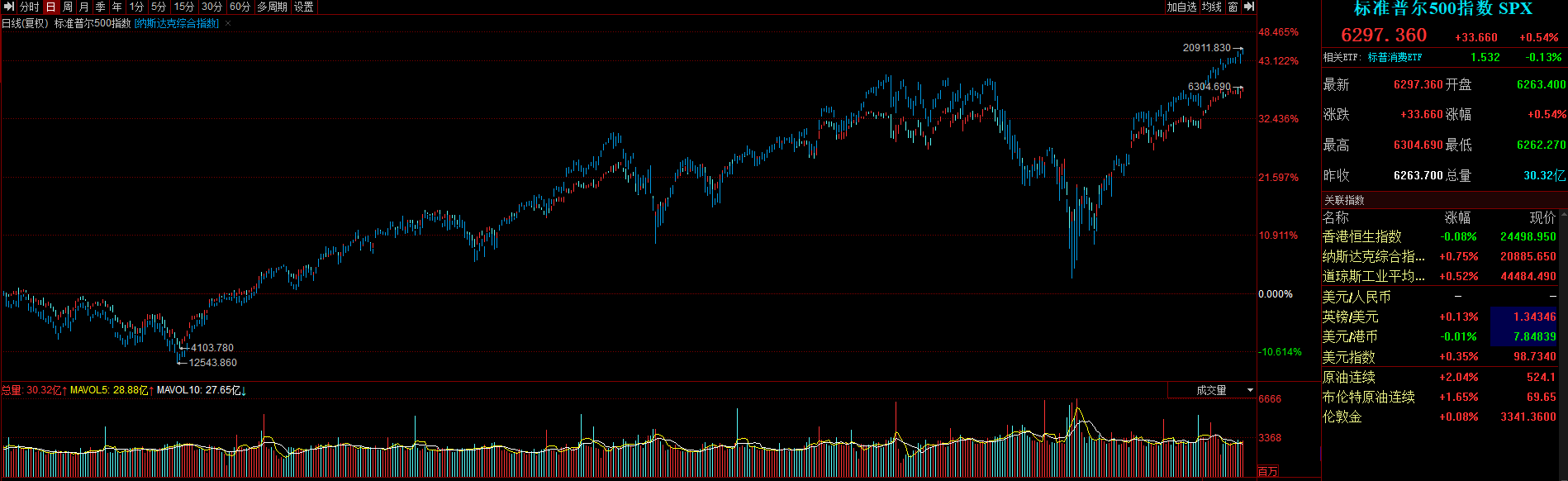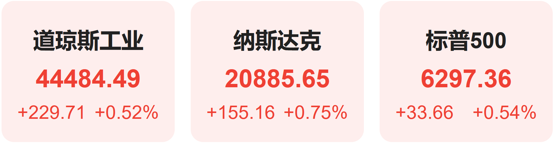 截至收盘,标普500指数涨0.54%,报6297.36点;道琼斯指数涨0.52%,报44484.49点;纳斯达克指数涨0.75%,报20885.65点。标普500指数和纳斯达克指数再度双双刷新历史收盘新高。