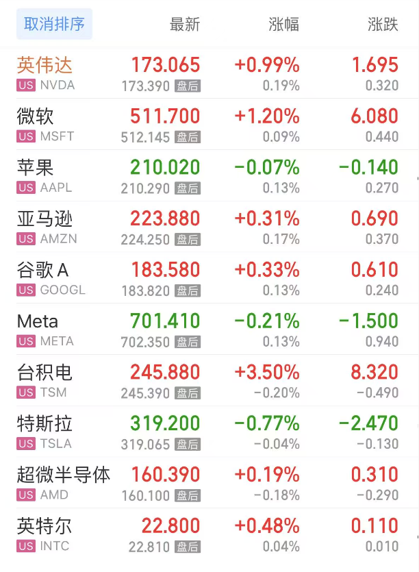 热门美股中,英伟达涨0.95%,微软涨1.20%,苹果跌0.07%,亚马逊涨0.31%,谷歌C涨0.51%,谷歌A涨0.33%,Meta跌0.21%,台积电涨3.37%,特斯拉跌0.70%,超微半导体涨0.21%。