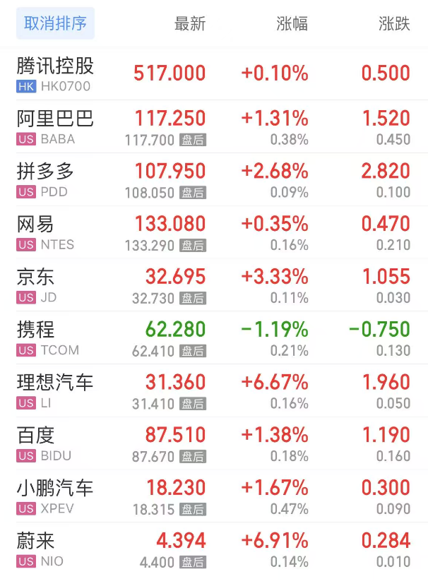 热门中概股方面,腾讯控股(港股)涨0.10%,阿里巴巴涨1.30%,拼多多涨2.70%,网易涨0.44%,携程跌1.13%,理想汽车涨6.67%,百度涨1.38%,小鹏汽车涨1.70%,蔚来涨6.93%。