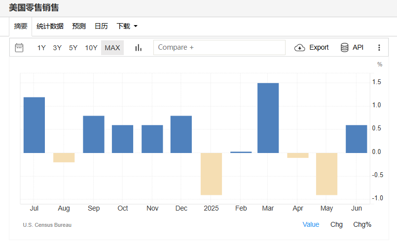 尽管特朗普的关税政策已开始产生影响,但美国消费者似乎仍在积极消费。美国6月份零售销售环比增长0.6%,扭转了此前连续两个月的跌势,超出了大部分经济学家的预期。汽车销售在连续两个月下滑后出现攀升,成为推动整体增长的重要因素。