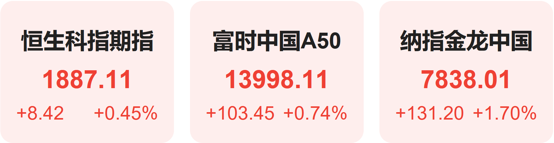 7月22日,隔夜恒生科技指数期货上涨0.45%,纳斯达克中国金龙指数上涨1.70%,富时中国A50指数上涨0.74%。
