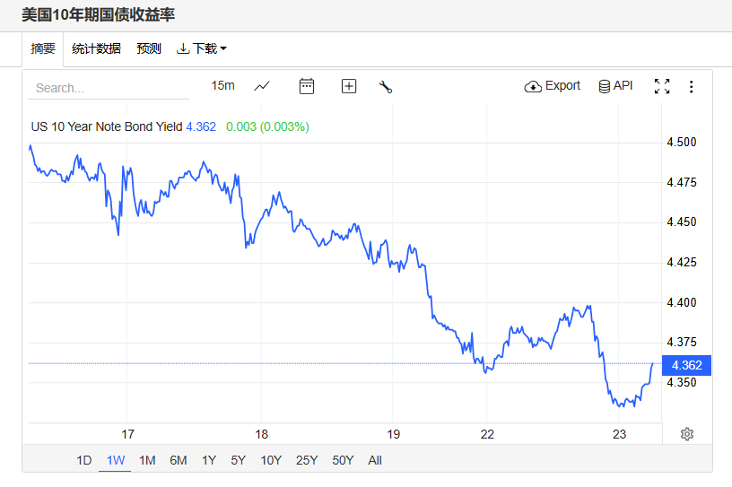 美债收益率全线走低,基准的10年期美债收益率收报4.362%,对利率更加敏感的2年期美债收益率收报3.852%。
