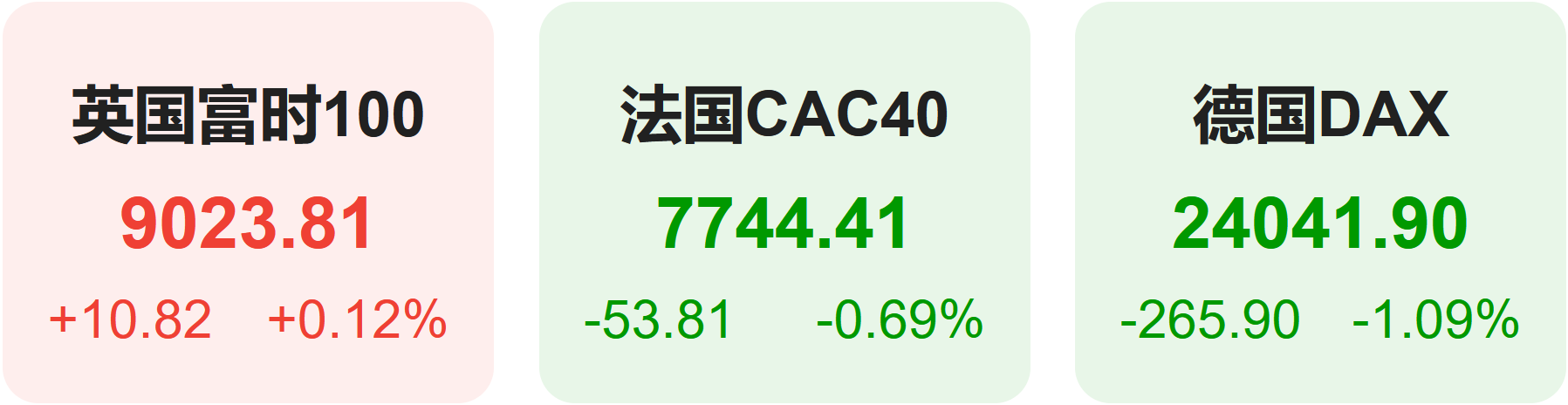 欧洲股市方面,英国富时100指数小幅上涨0.12%,报9024点。法国CAC40指数小幅下跌0.69%,报7744点。德国DAX指数下跌1.09%,报24042点。