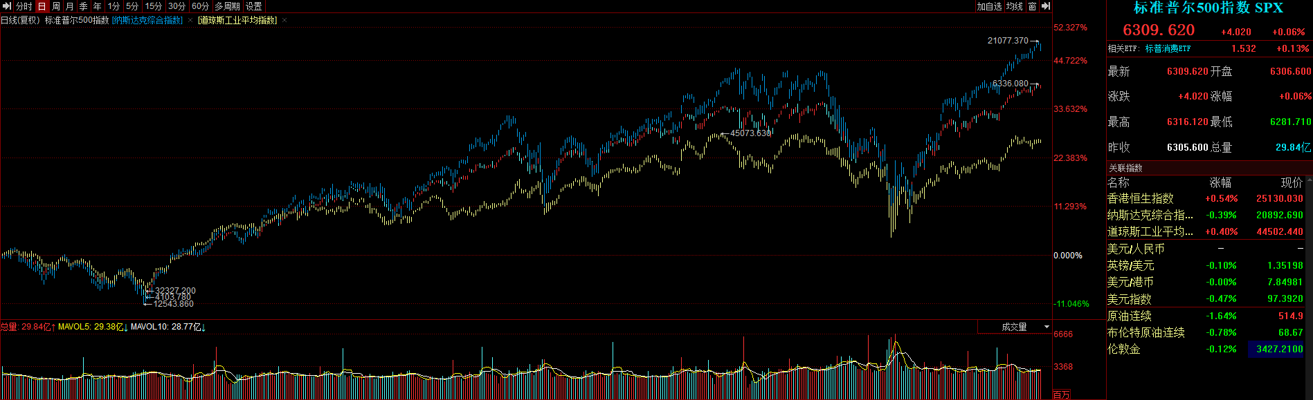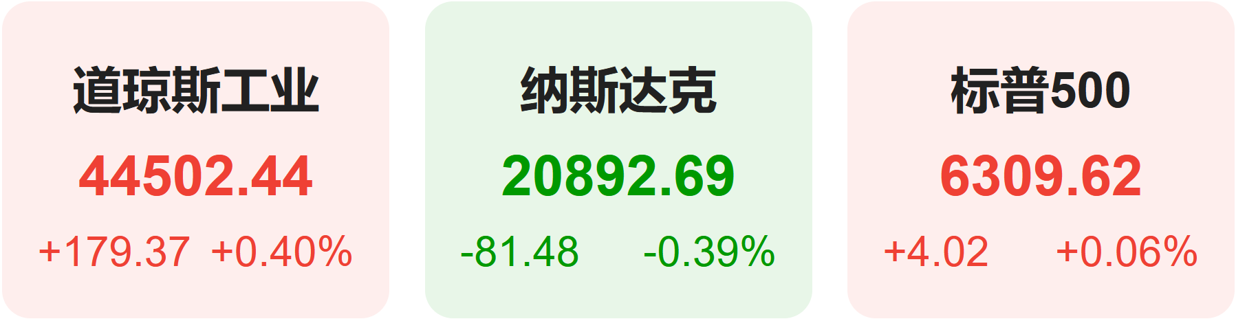 截至收盘,标普500指数涨0.06%,报6309.62点;道琼斯指数涨0.40%,报44502.44点;纳斯达克指数跌0.39%,报20892.69点。