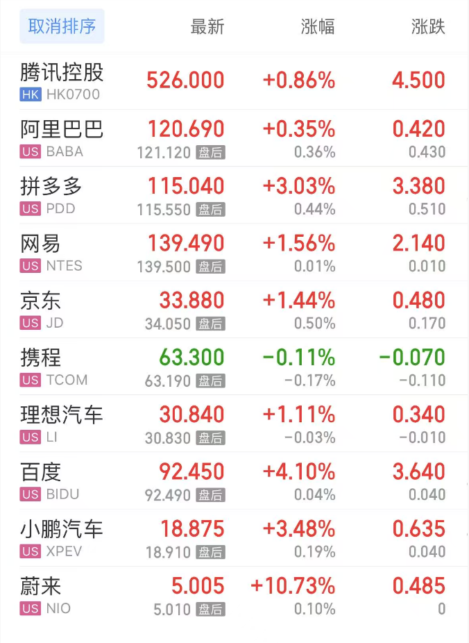 热门中概股方面,腾讯控股(港股)涨0.86%,阿里巴巴涨0.35%,拼多多涨3.03%,网易涨1.56%,携程跌0.11%,理想汽车涨1.12%,百度涨4.10%,小鹏汽车涨3.48%,蔚来涨10.73%。