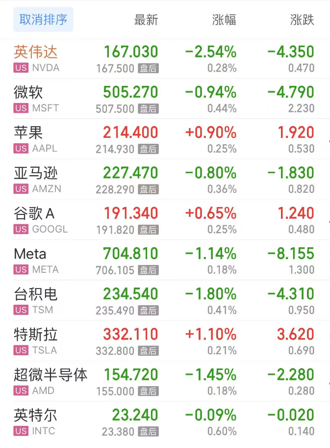 热门美股中,英伟达跌2.54%,微软跌0.94%,苹果涨0.90%,亚马逊跌0.80%,谷歌C涨0.50%,谷歌A涨0.65%,Meta跌1.14%,台积电跌1.81%,特斯拉涨1.10%,超微半导体跌1.45%,英特尔跌0.09%。