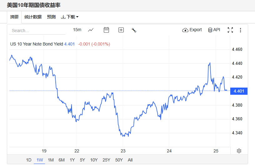 美债收益率延续反弹趋势,基准的10年期美债收益率收报4.401%,对利率更加敏感的2年期美债收益率收报3.931%。