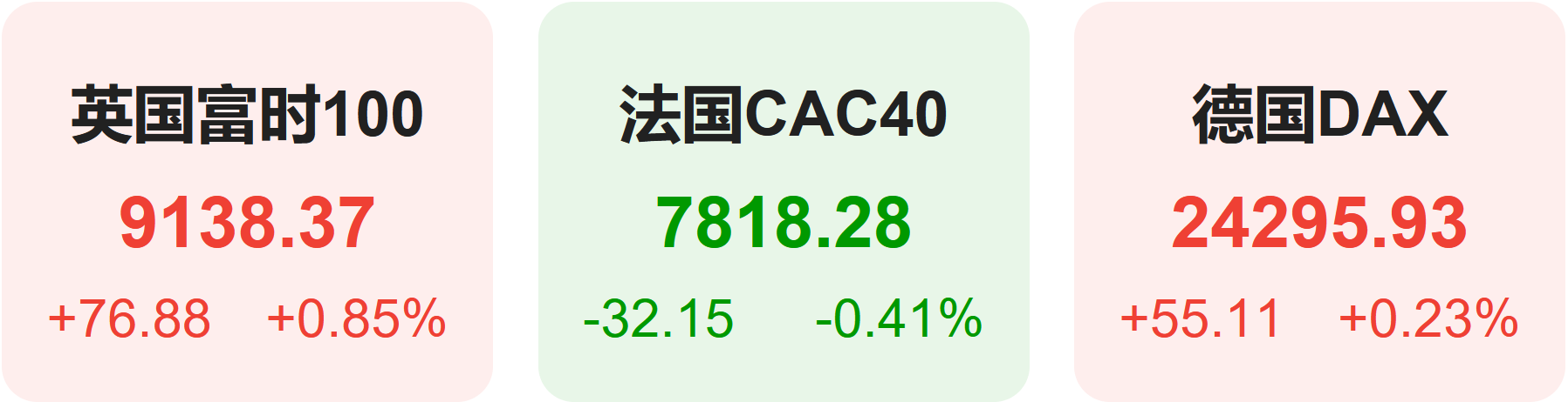 欧洲股市方面,英国富时100指数小幅上涨0.85%,报9138点。法国CAC40指数小幅下跌0.41%,报7818点。德国DAX指数小幅上涨0.23%,报24296点。