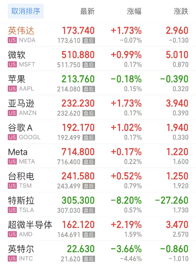 热门美股中,英伟达涨1.73%,微软涨0.99%,苹果跌0.18%,亚马逊涨1.73%,谷歌C涨0.88%,谷歌A涨1.02%,Meta涨0.17%,台积电涨0.52%,特斯拉跌8.20%,超微半导体涨2.19%。