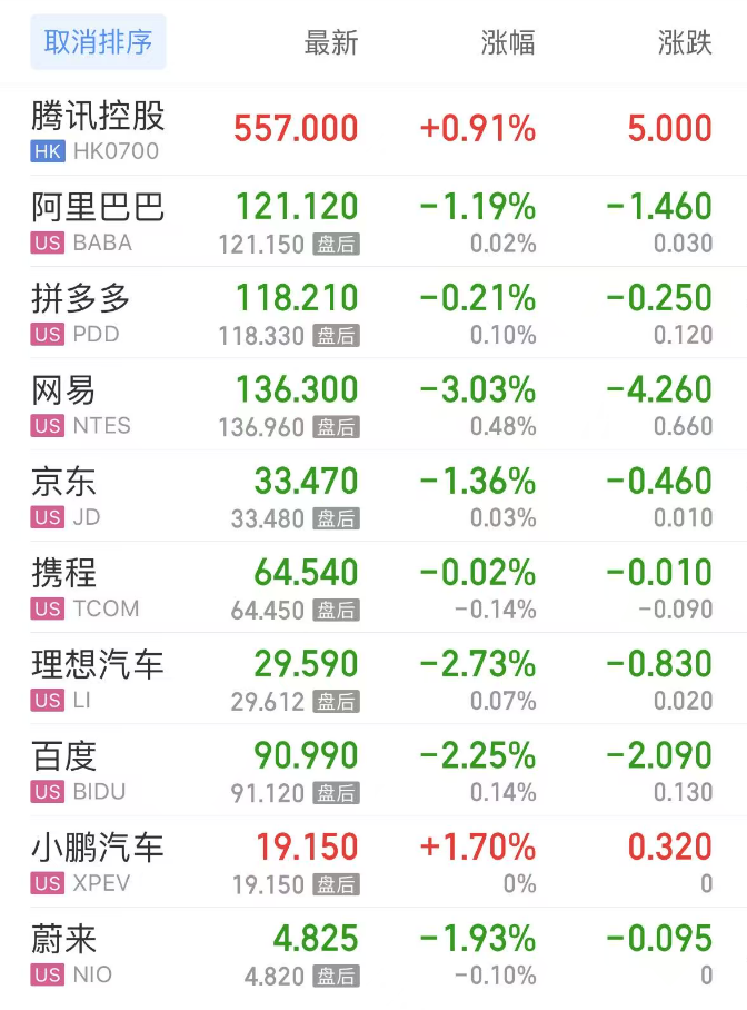 热门中概股方面,腾讯控股(港股)涨0.91%,阿里巴巴跌1.19%,拼多多跌0.21%,网易跌3.03%,携程跌0.02%,理想汽车跌2.73%,百度跌2.25%,小鹏汽车涨1.70%,蔚来跌1.93%。