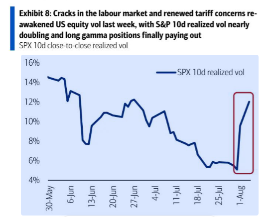 图表 :劳动力市场出现裂痕,关税担忧重现,上周美国股市波动率被重新激活,标普 500 指数 10 日实际波动率几乎翻倍,多头伽马持仓终于获得回报