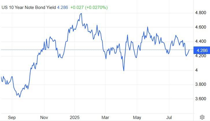 10年期美国国债收益率收4.286%,与8月5日触及的4.19%三个月低点保持相对接近,因经济放缓的迹象增多,强化了美联储今年多次降息的理由。与美联储政策利率最敏感的2年期美债收益率则收报3.77%。