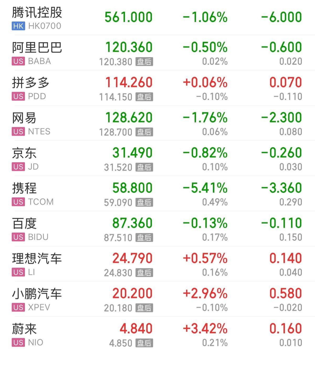上周五热门中概股方面,腾讯控股(港股)跌1.06%,阿里巴巴跌0.50%,拼多多涨0.06%,网易跌1.76%,携程跌5.41%,百度跌0.13%,理想汽车涨0.57%,小鹏汽车涨2.96%,蔚来涨3.42%。