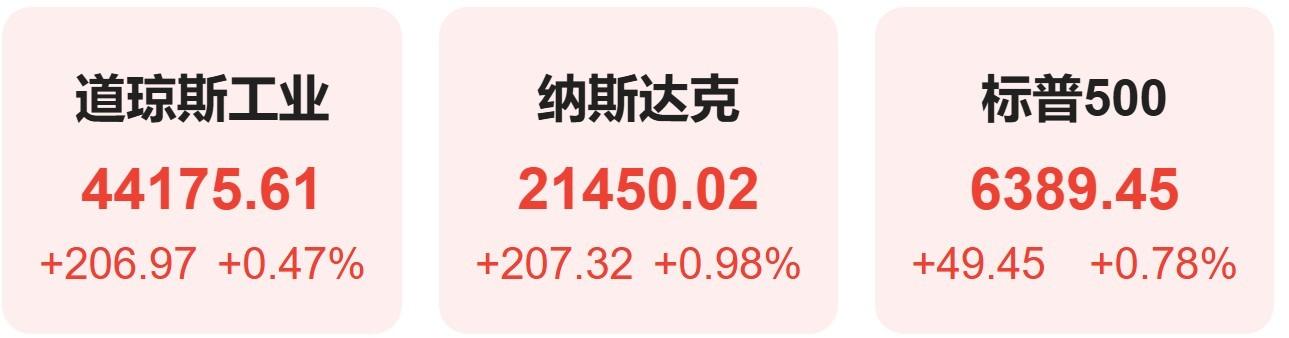 截至上周五收盘,道琼斯指数涨0.47%,报44175.61点;标普500指涨0.78%,报6389.45点;纳斯达克指数涨0.98%,报21450.02点。