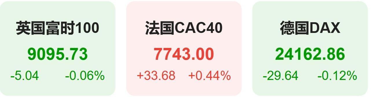 上周五,欧洲股市方面,英国富时100指数小幅下跌0.06%,报9096点。法国CAC40指数涨0.44%,报7743点。德国DAX指数跌0.12%,报24162.86点。