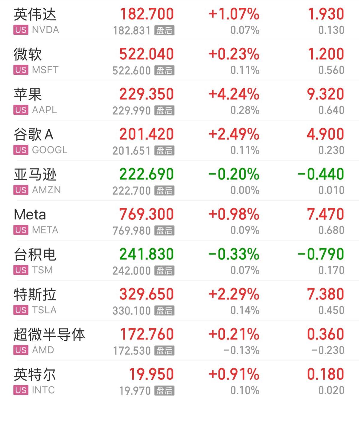 热门美股中,英伟达涨1.07%,微软涨0.23%,苹果涨4.24%,谷歌A涨2.49%,亚马逊跌0.20%,Meta涨0.98%,台积电跌0.33%,特斯拉涨2.29%,超微半导体涨0.21%。