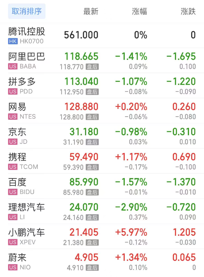 热门中概股方面,腾讯控股(港股)涨0.00%,阿里巴巴跌1.41%,拼多多跌1.07%,网易涨0.20%,携程涨1.17%,百度跌1.57%,理想汽车跌2.90%,小鹏汽车涨5.97%,蔚来涨1.34%。