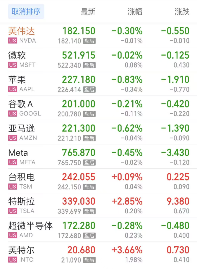 热门美股中,英伟达跌0.30%,微软跌0.02%,苹果跌0.83%,谷歌C跌0.23%,谷歌A跌0.21%,亚马逊跌0.62%,Meta跌0.45%,台积电涨0.09%,特斯拉涨2.85%,超微半导体跌0.28%。