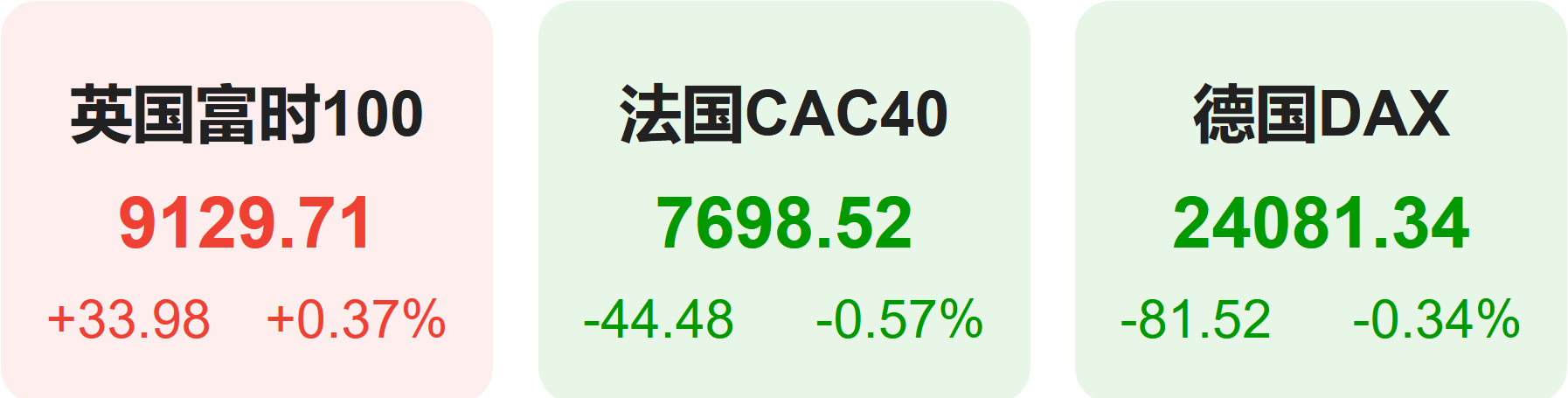 欧洲股市方面,英国富时100指数小幅上涨0.37%,报9130点。法国CAC40指数小幅下跌0.57%,报7699点。德国DAX指数小幅下跌0.34%,报24081点。