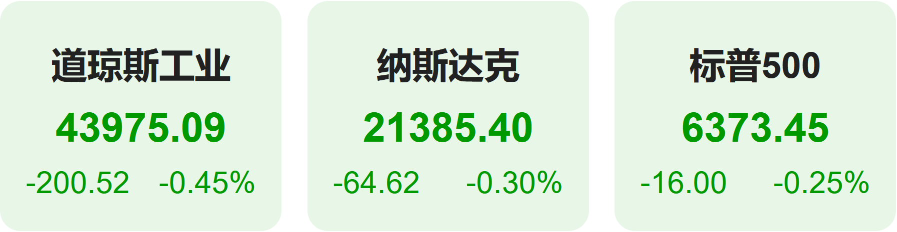 截至收盘,标普500指数跌0.25%,报6373.45点,冲击6400点失败;道琼斯指数跌0.45%,报43975.09点;纳斯达克指数跌0.30%,报21385.40点。