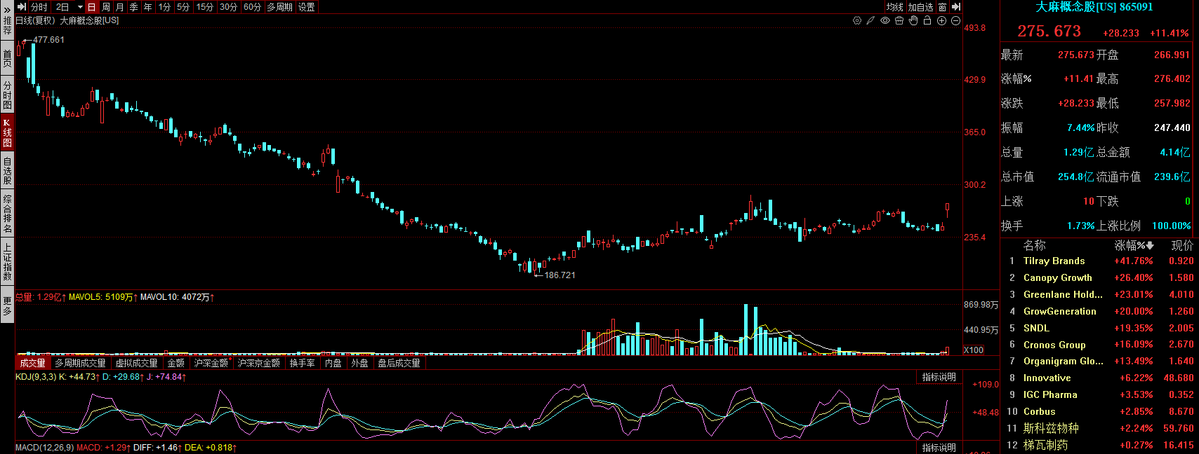 美东时间周一(8月11日),投资者静待美国7月CPI数据,以观察美国通胀压力并寻找美联储能否在9月降息相关线索,美股冲高回落最终小幅收跌,但纳指标普依然处于历史高位附近。大麻概念股飙涨,特朗普重新分类大麻危险等级,TLRY飙升逾40%。