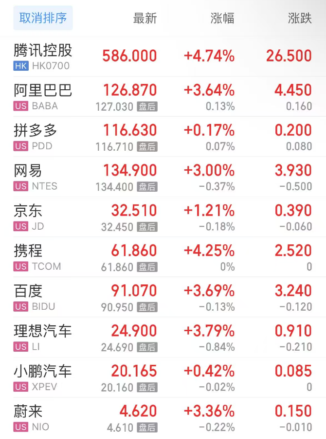 热门中概股方面,腾讯控股(港股)涨4.74%,阿里巴巴涨3.64%,拼多多涨0.17%,网易涨3.00%,携程涨4.25%,百度涨3.69%,理想汽车涨3.79%,小鹏汽车涨0.42%,蔚来涨3.36%。