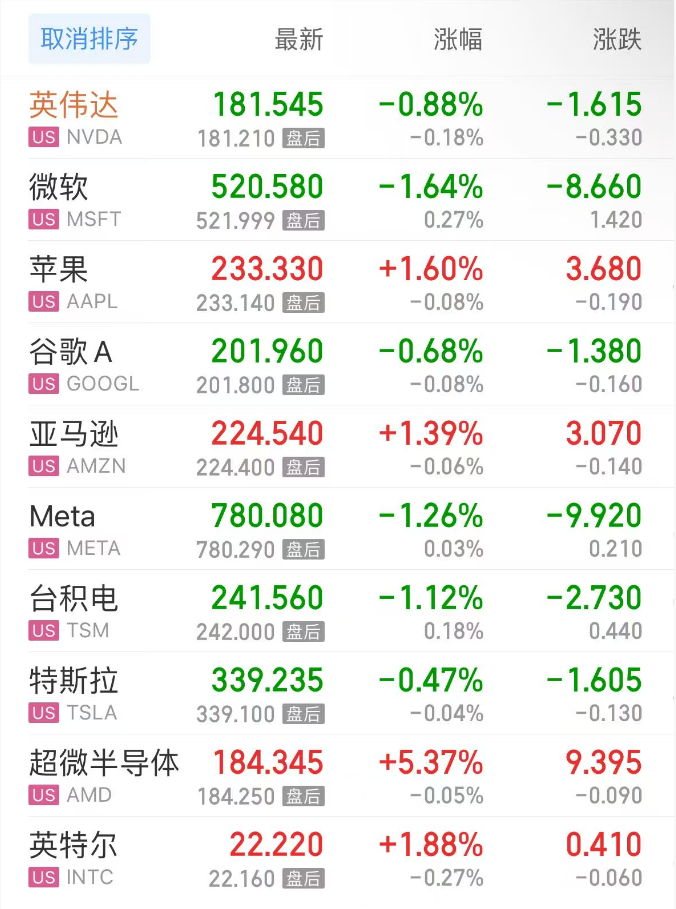 热门美股中,英伟达跌0.88%,微软跌1.64%,苹果涨1.60%,谷歌C跌0.55%,谷歌A跌0.68%,亚马逊涨1.39%,Meta跌1.26%,台积电跌1.12%,特斯拉跌0.47%,超微半导体涨5.37%。
