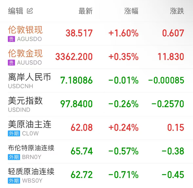 受美元走弱和美债收益率下降提振,现货黄金有所上行,伦敦金收涨0.36%,收报3362.35美元/盎司;伦敦银收涨1.6%,报38.516美元/盎司。