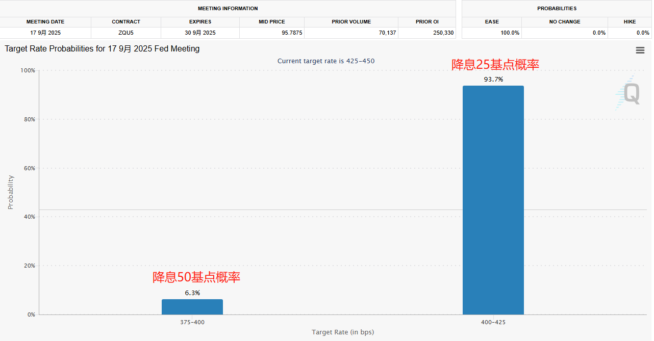 纽约时间下午3点前,联邦基金利率期货8月和10月合约交易活跃,担保隔夜融资利率(SOFR)期货2025年9月合约出现大量交易。与美联储9月政策会议挂钩的OIS利率因此降至日内低点,接近4.08%,显示有一次25个基点降息的可能性为100%。截至发稿,降息25几点概率为93.7%,降息50基点的概率为6.3%。