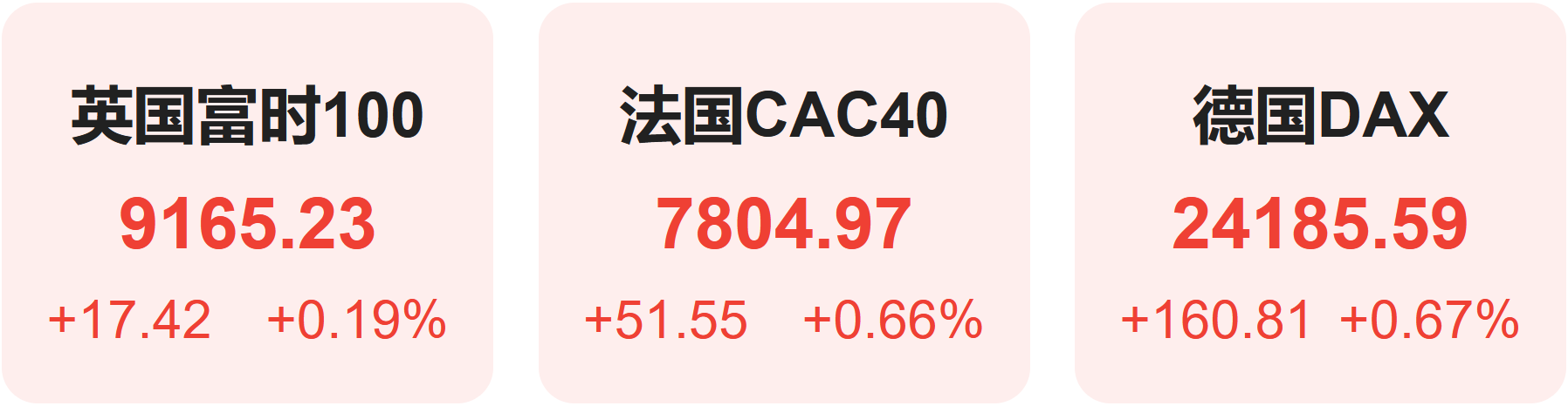 欧洲股市方面,英国富时100指数小幅上涨0.19%,报9165点。法国CAC40指数小幅上涨0.66%,报7805点。德国DAX指数小幅上涨0.67%,报24186点。