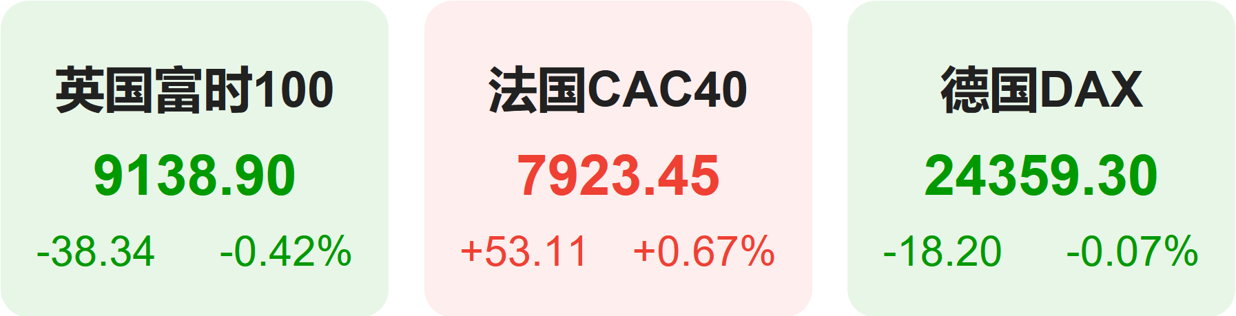 上周五,欧洲股市方面,英国富时100指数小幅下跌0.42%,报9139点。法国CAC40指数小幅上涨0.67%,报7923点。德国DAX指数小幅下跌0.07%,报24359点。