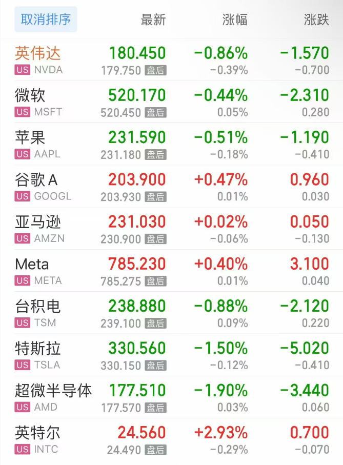 热门美股中,英伟达跌0.86%,微软跌0.44%,苹果跌0.51%,谷歌C涨0.53%,谷歌A涨0.47%,亚马逊涨0.02%,Meta涨0.40%,台积电跌0.88%,特斯拉跌1.50%,超微半导体跌1.90%,英特尔涨2.93%。