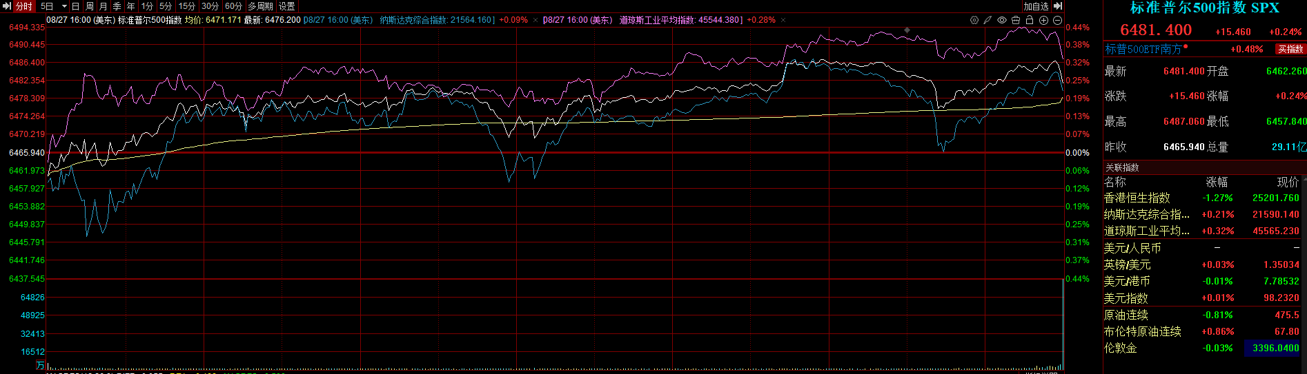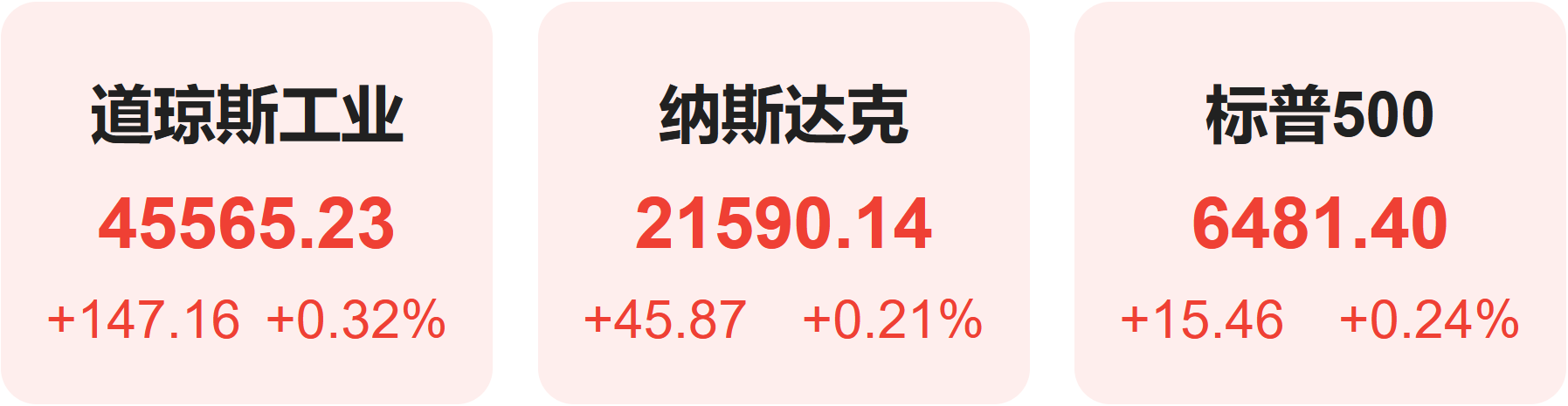 截至收盘,标普500指数涨0.24%,报6481.40点;道琼斯指数涨0.32%,报45565.23点;纳斯达克指数涨0.21%,报21590.14点。