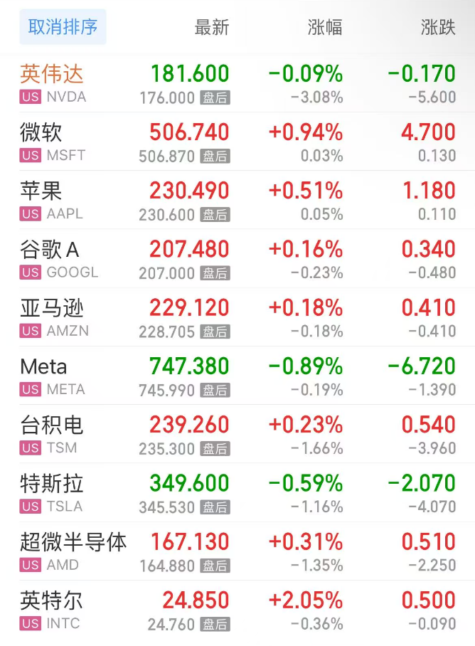 热门美股中,英伟达跌0.09%,微软涨0.94%,苹果涨0.52%,谷歌C涨0.13%,谷歌A涨0.16%,亚马逊涨0.18%,Meta跌0.89%,台积电涨0.23%,特斯拉跌0.59%,超微半导体涨0.31%,英特尔涨2.05%。