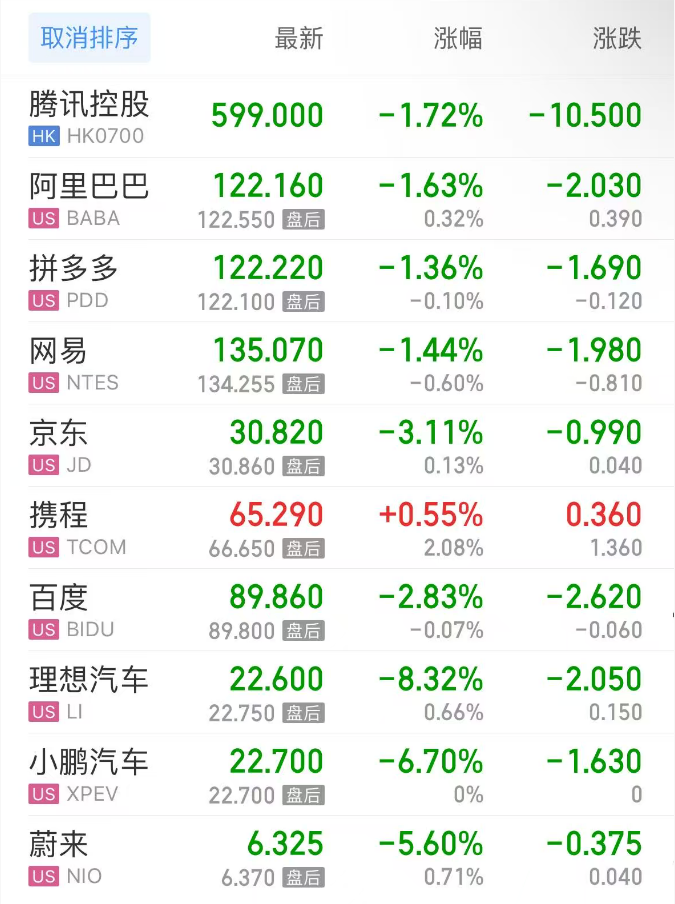 热门中概股方面,腾讯控股(港股)跌1.72%,阿里巴巴跌1.64%,拼多多跌1.36%,网易跌1.45%,携程涨0.55%,百度跌2.83%,理想汽车跌8.32%,小鹏汽车跌6.70%,蔚来跌5.60%。
