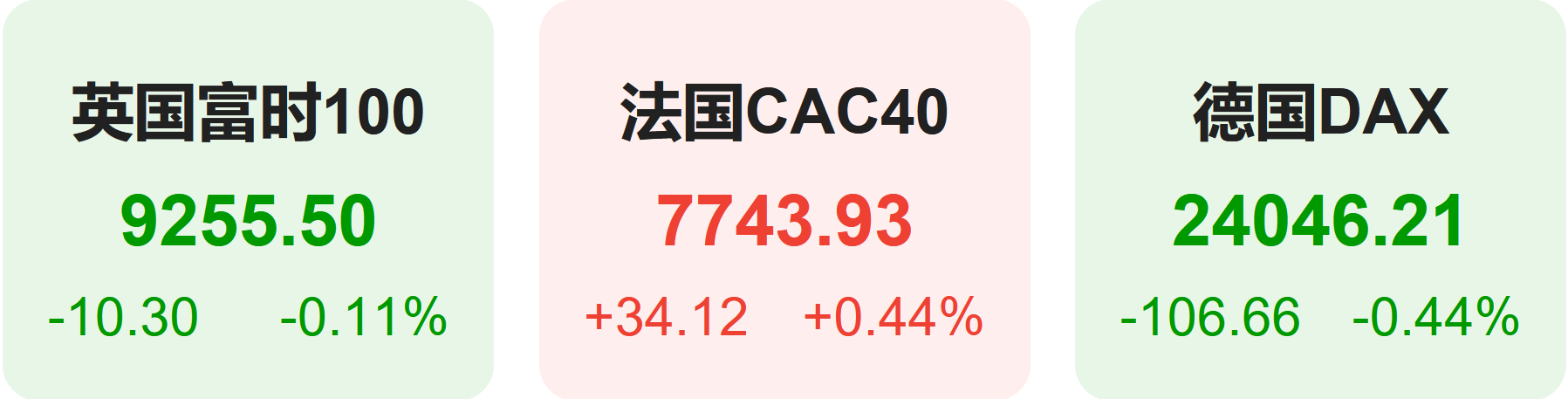 欧洲股市方面,英国富时100指数小幅下跌0.11%,报9256点。法国CAC40指数小幅上涨0.44%,报7744点。德国DAX指数小幅下跌0.44%,报24046点。