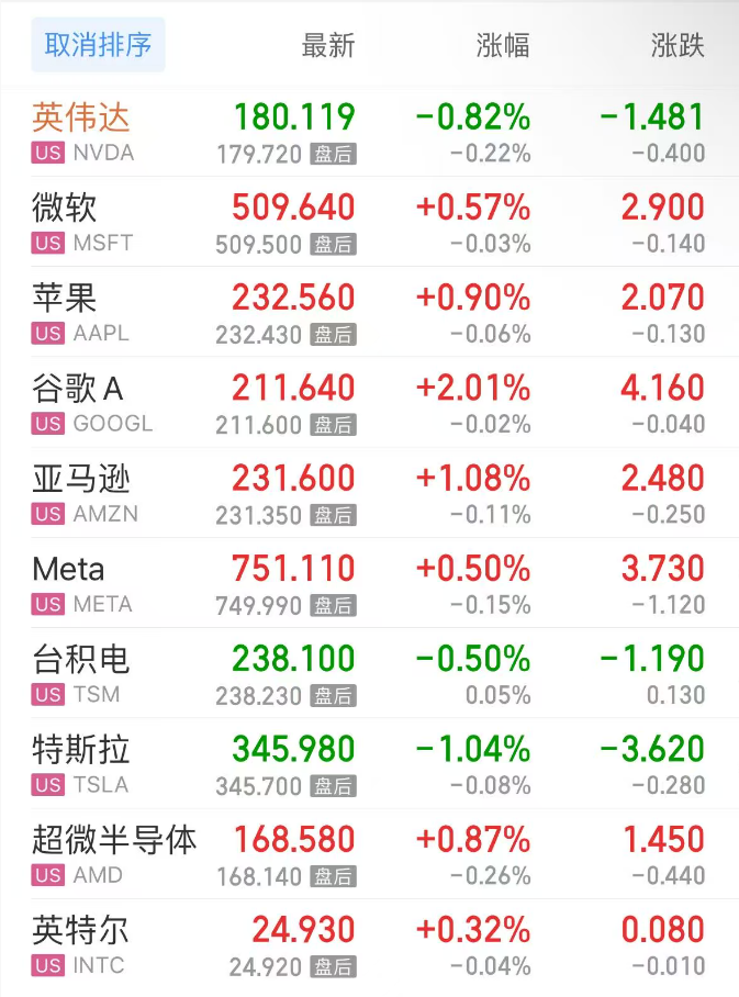 热门美股中,英伟达跌0.82%,微软涨0.57%,苹果涨0.90%,谷歌C涨2.00%,谷歌A涨2.01%,亚马逊涨1.08%,Meta涨0.50%,台积电跌0.50%,特斯拉跌1.04%,超微半导体涨0.87%,英特尔涨0.32%。