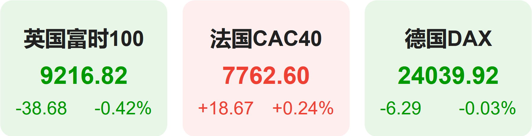 欧洲股市方面,英国富时100指数小幅下跌0.42%,报9217点。法国CAC40指数小幅上涨0.24%,报7763点。德国DAX指数小幅下跌0.03%,报24040点。