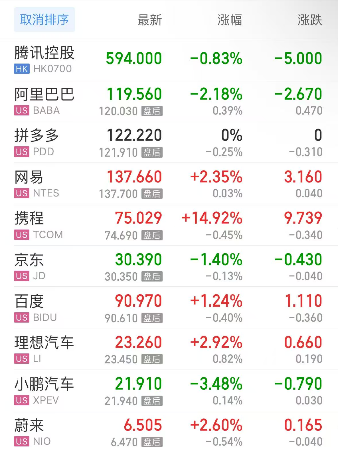 热门中概股方面,腾讯控股(港股)跌0.83%,阿里巴巴跌2.18%,拼多多涨0.00%,网易涨2.35%,携程涨14.92%,百度涨1.24%,理想汽车涨2.92%,小鹏汽车跌3.48%,蔚来涨2.60%。
