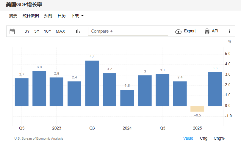 美国二季度实际GDP增长3.3%,高于此前报告的3.0%。修正的关键驱动力是商业投资,其增速从初报的1.9%大幅上修为5.7%,反映了软件和运输设备投资的增强。净出口对GDP贡献近5个百分点,创下有记录以来最高水平。