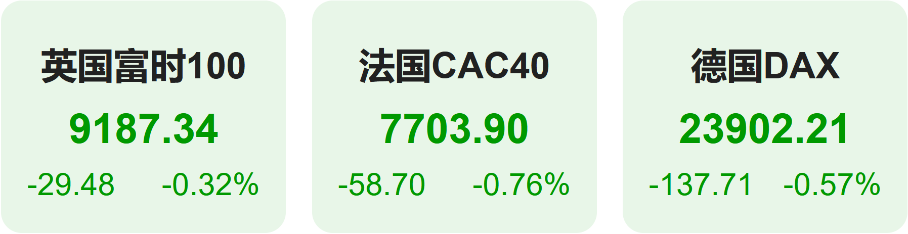 上周五欧洲股市方面,英国富时100指数小幅下跌0.32%,报9187点。法国CAC40指数小幅下跌0.76%,报7704点。德国DAX指数小幅下跌0.57%,报23902点。