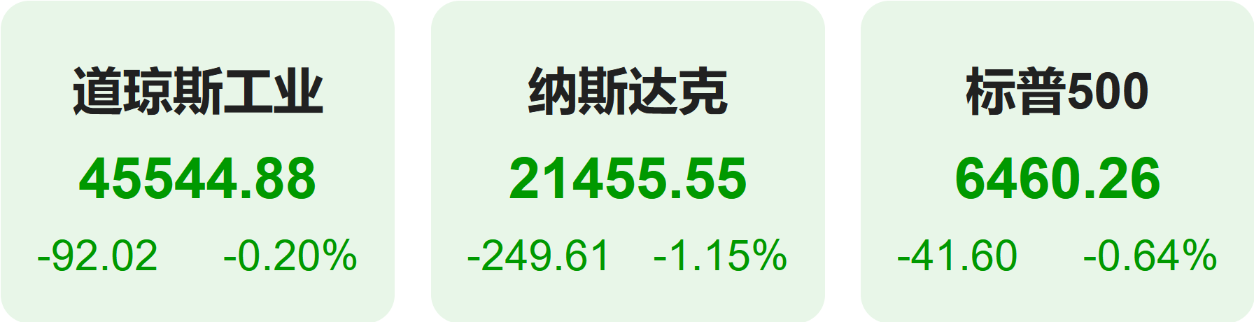 截至上周五收盘,标普500指数跌0.64%,报6460.26点;道琼斯指数跌0.20%,报45544.88点;纳斯达克指数跌1.15%,报21455.55点。
