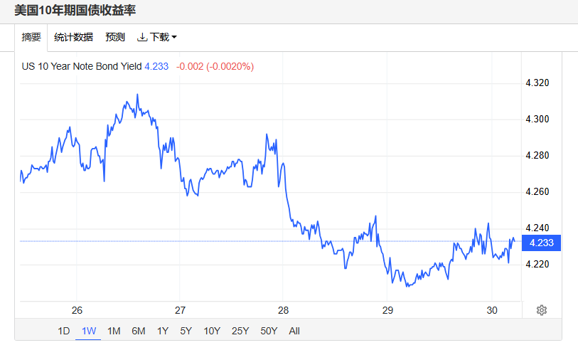 上周五,美债收益率涨跌不一,基准的10年期美债收益率收报4.233%,对利率更加敏感的2年期美债收益率收报3.625%。