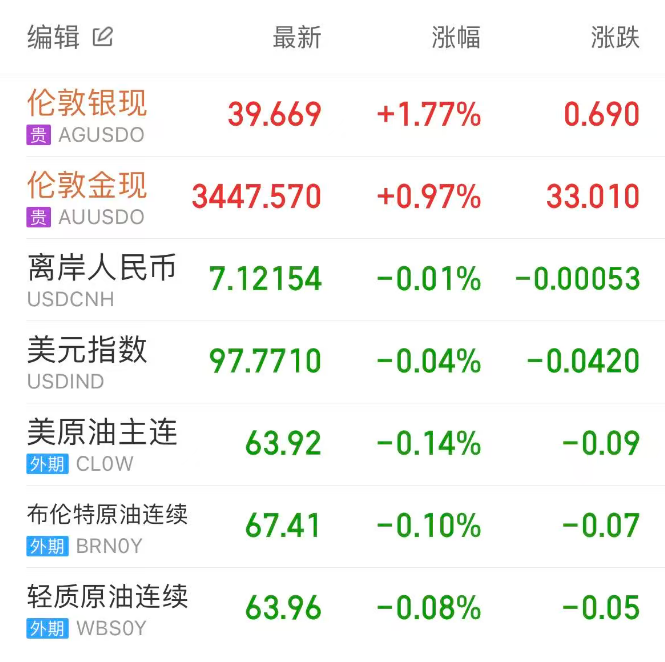 现货黄金连涨四日,尾盘一度站上3450美元关口,伦敦金最终收涨0.97%,收报3448美元/盎司,创4月以来最佳单月表现;伦敦银收涨1.77%,报39.669美元/盎司。