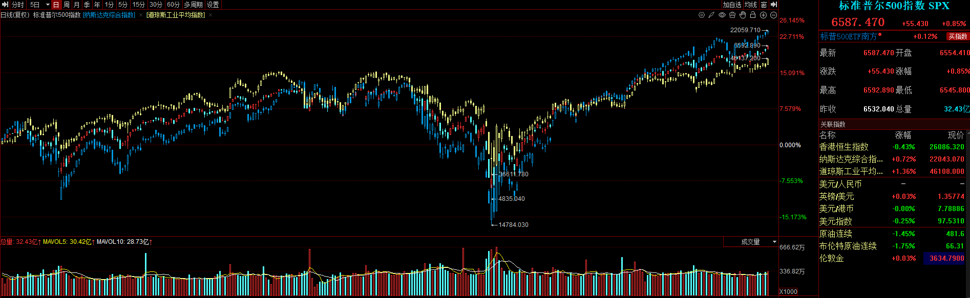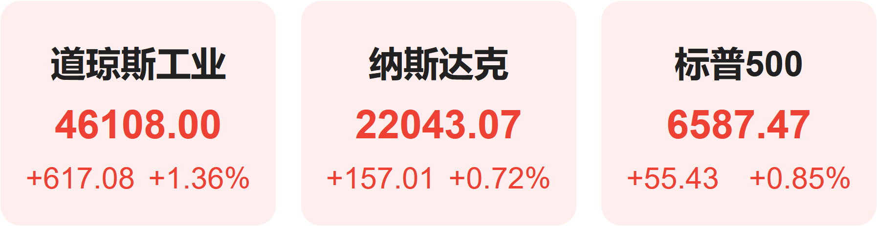 截至收盘,标普500指数涨0.85%,报6587.47点;道琼斯指数涨1.36%,报46108.00点;纳斯达克指数涨0.72%,报22043.07点。