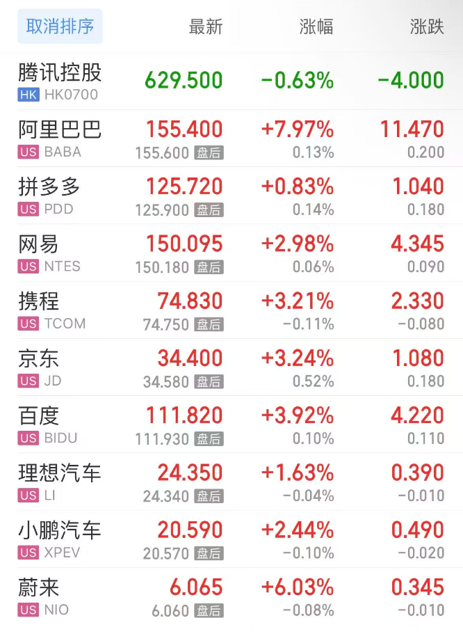 热门中概股方面,腾讯控股(港股)跌0.63%,阿里巴巴涨7.97%,拼多多涨0.83%,网易涨2.98%,携程涨3.21%,百度涨3.92%,理想汽车涨1.63%,小鹏汽车涨2.44%,蔚来涨6.03%。