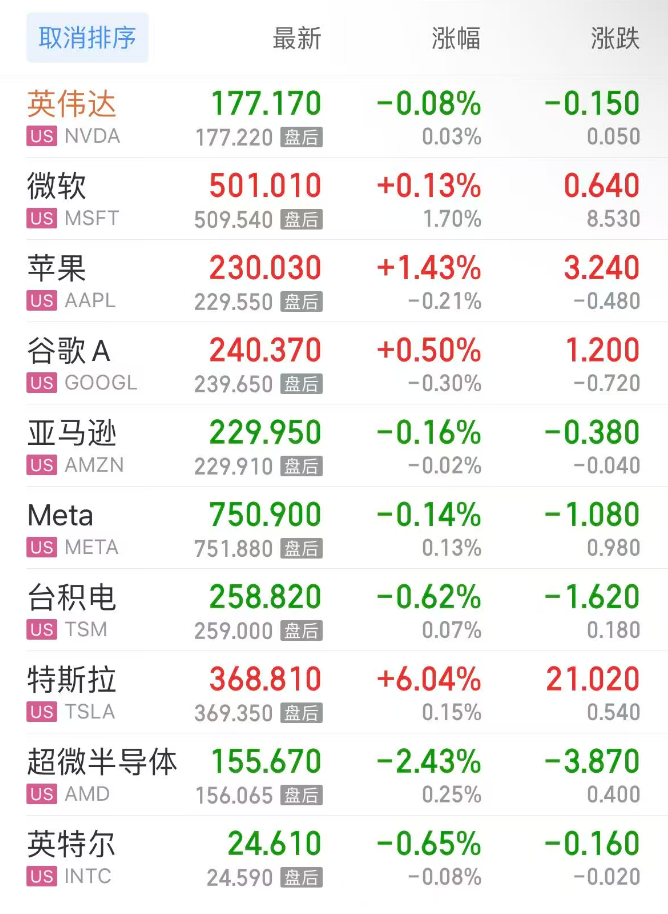 热门美股中,英伟达跌0.09%,微软涨0.13%,苹果涨1.43%,谷歌C涨0.51%,谷歌A涨0.50%,亚马逊跌0.17%,Meta跌0.14%,台积电跌0.62%,特斯拉涨6.04%,超微半导体跌2.43%,英特尔跌0.65%。