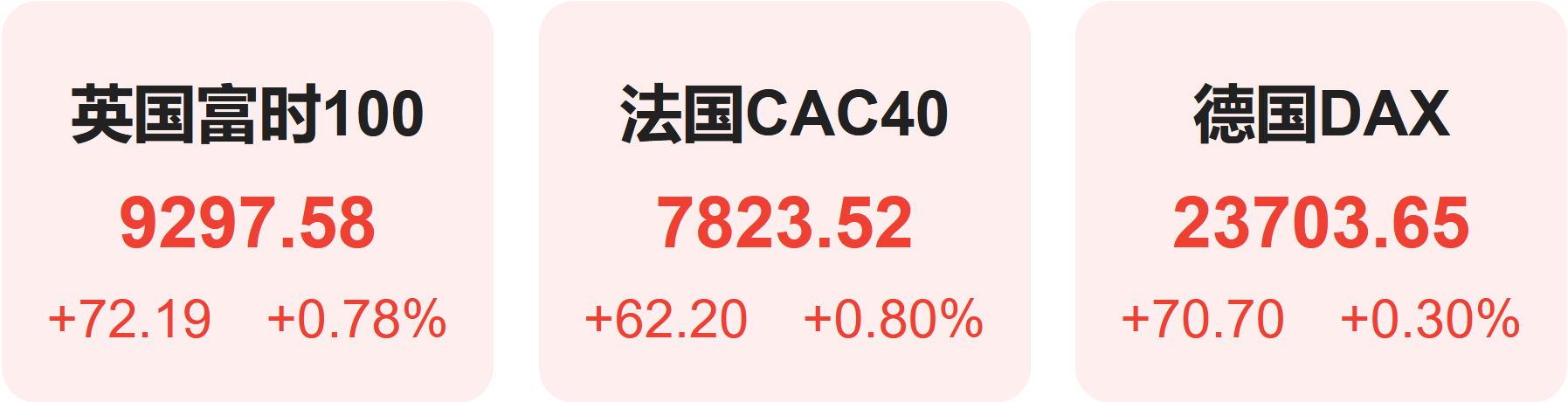 欧洲股市方面,法国CAC40上涨0.80% ,英国富时100上涨0.78% ,德国DAX上涨0.30% ,意大利富时MIB上涨0.89% ,俄罗斯RTS下跌1.08% 。
